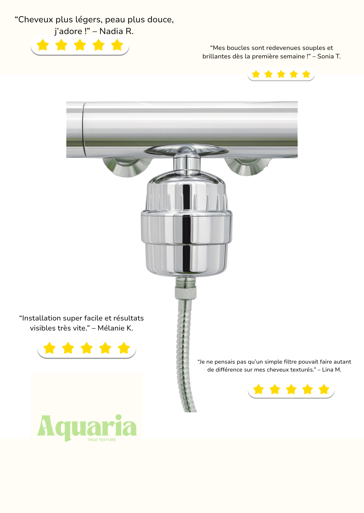 C’est cette conviction qui a donné naissance à notre filtre de douche spécialement conçu pour les cheveux texturés un soin invisible, mais essentiel, qui transforme votre routine quotidienne en un véritable moment de bien-être. Grâce à sa technologie de filtration naturelle en plusieurs étapes, le filtre Aquaria élimine le chlore, le calcaire et les impuretés responsables de la sécheresse et des frisottis.
